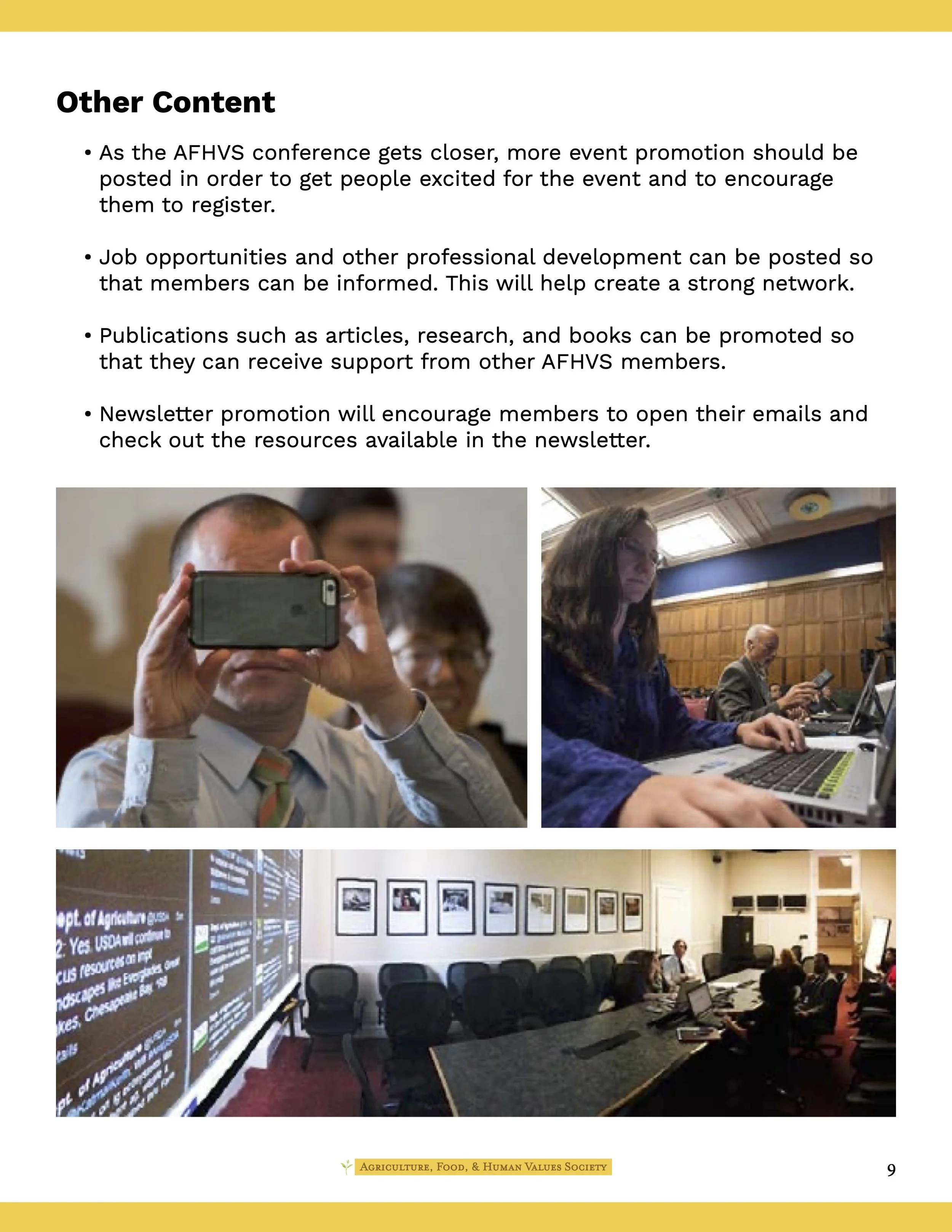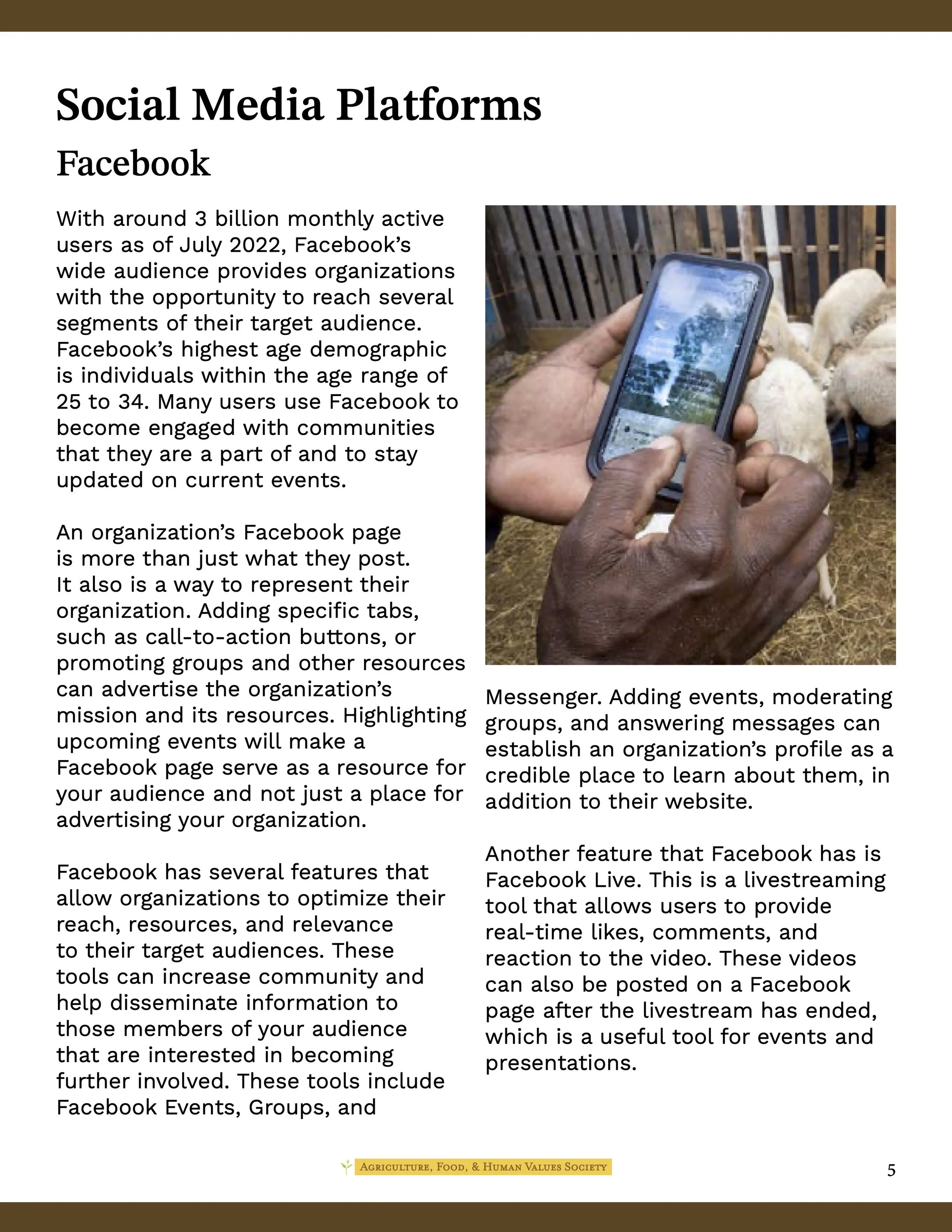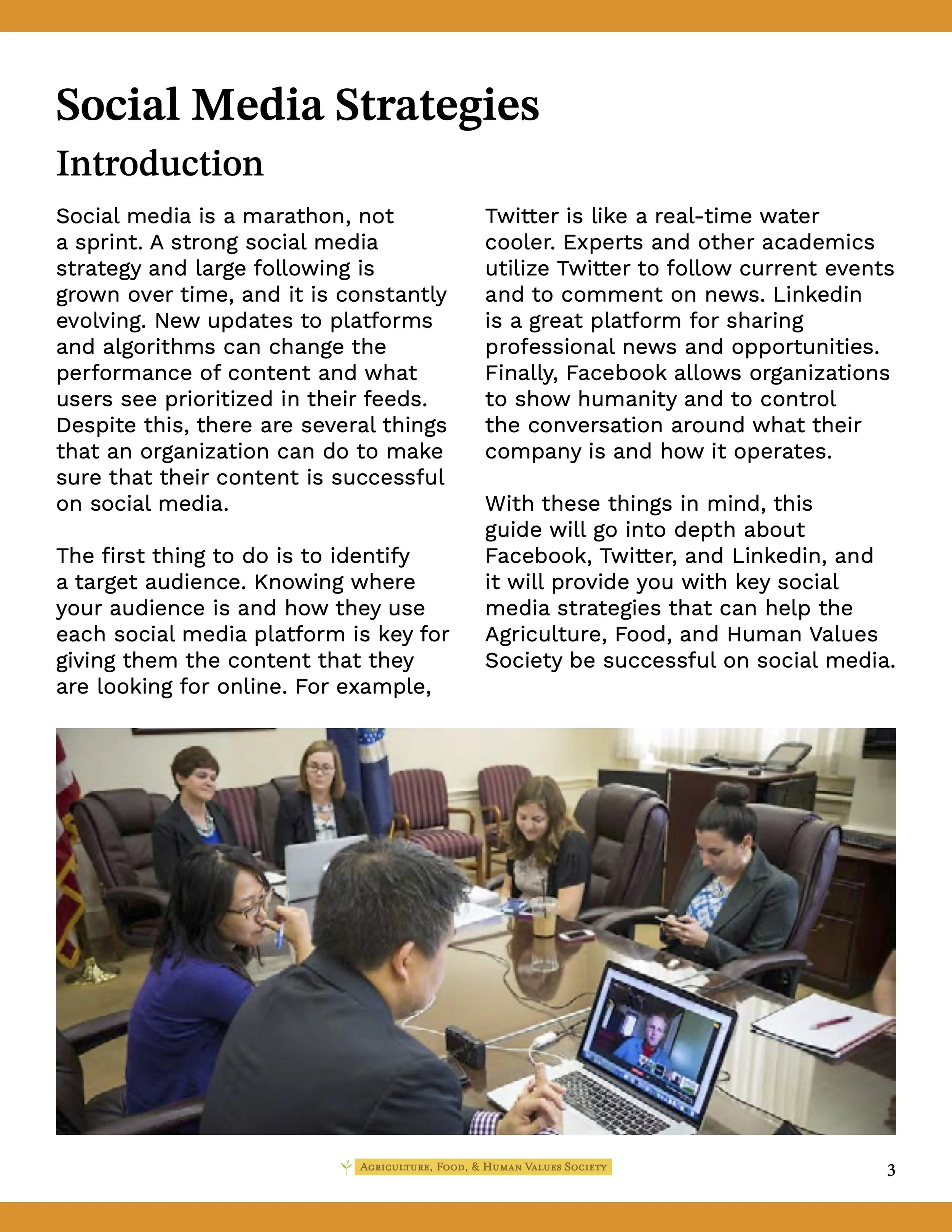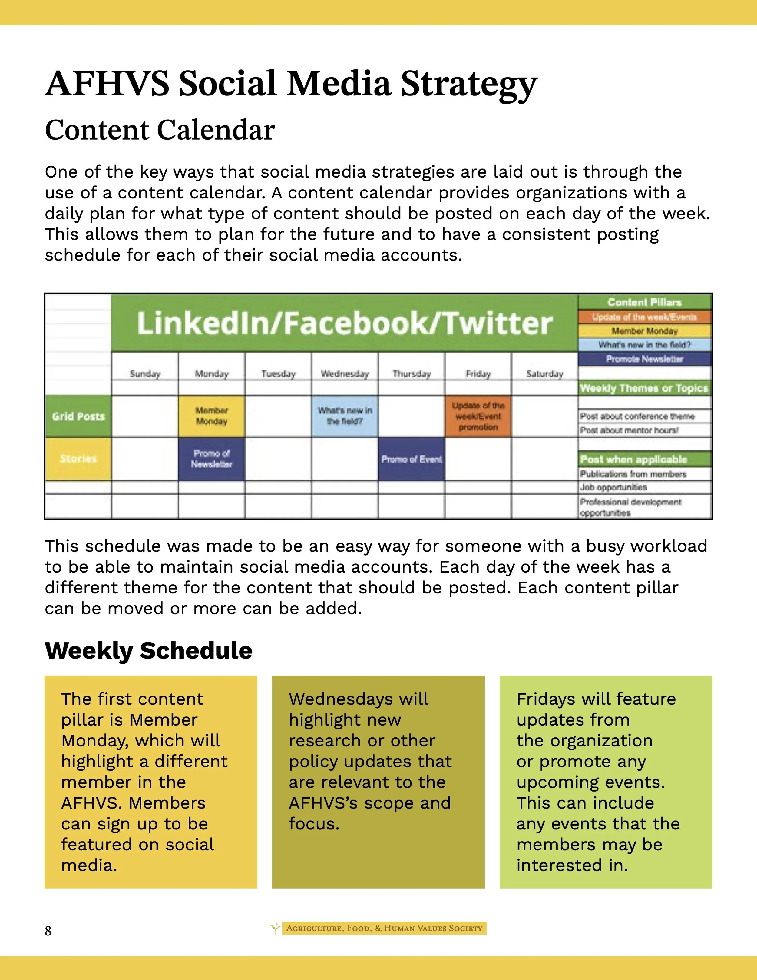 The deliverables for this project included the development of a digital “Social Media and Communications Guide” that outlines a coherent social media and communications strategy that can later be implemented by the AFHVS staff. They would like a coherent, clear, consistent process that different people can easily learn, adapt, and use.