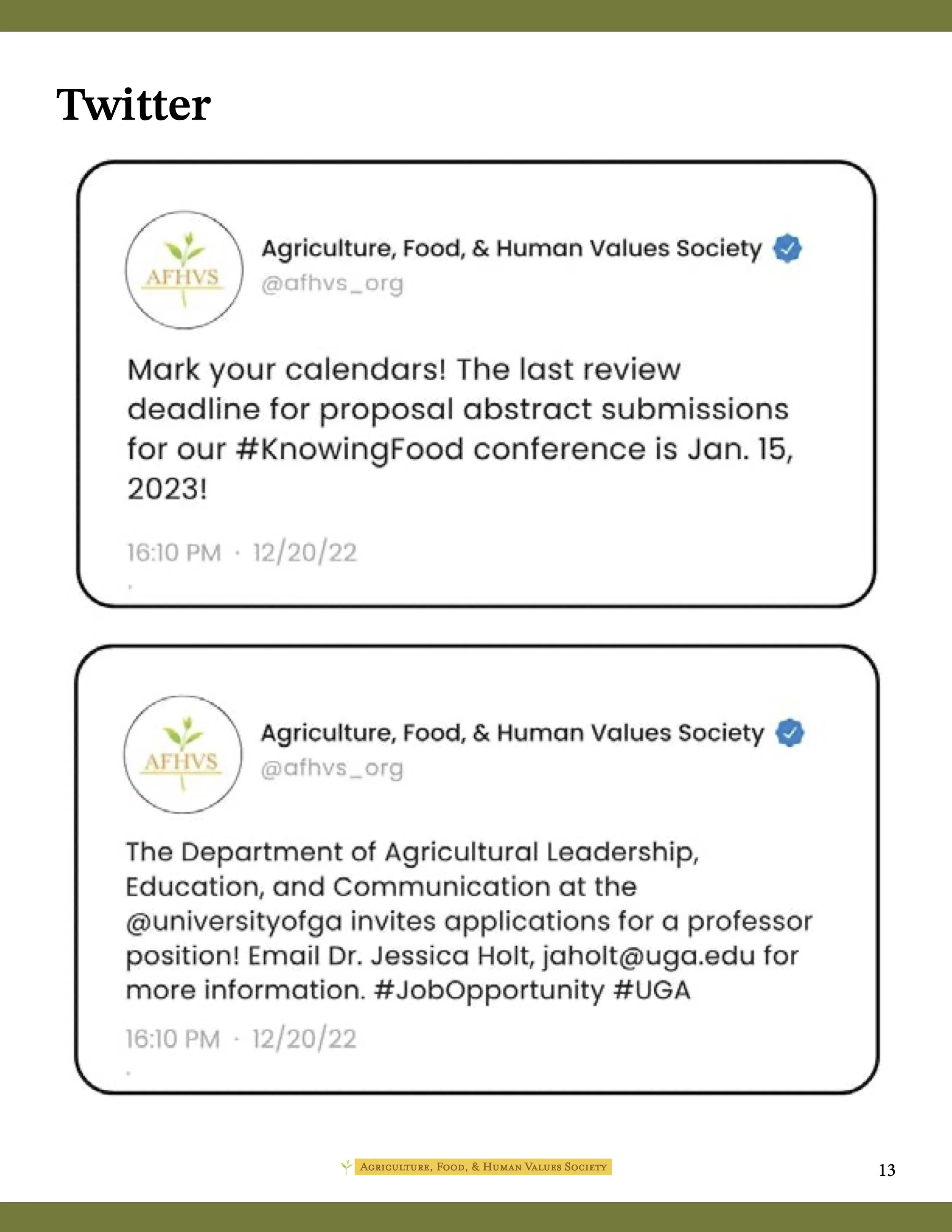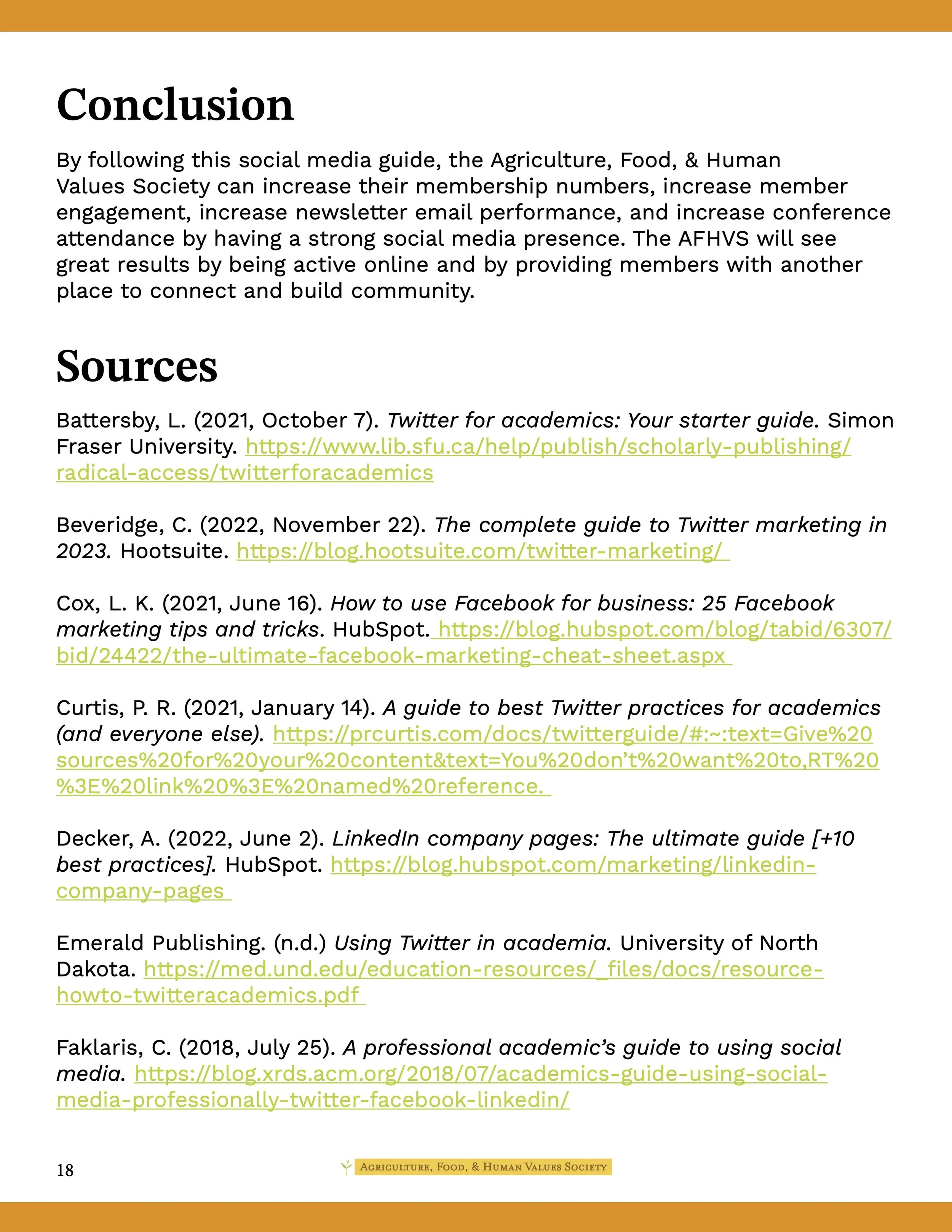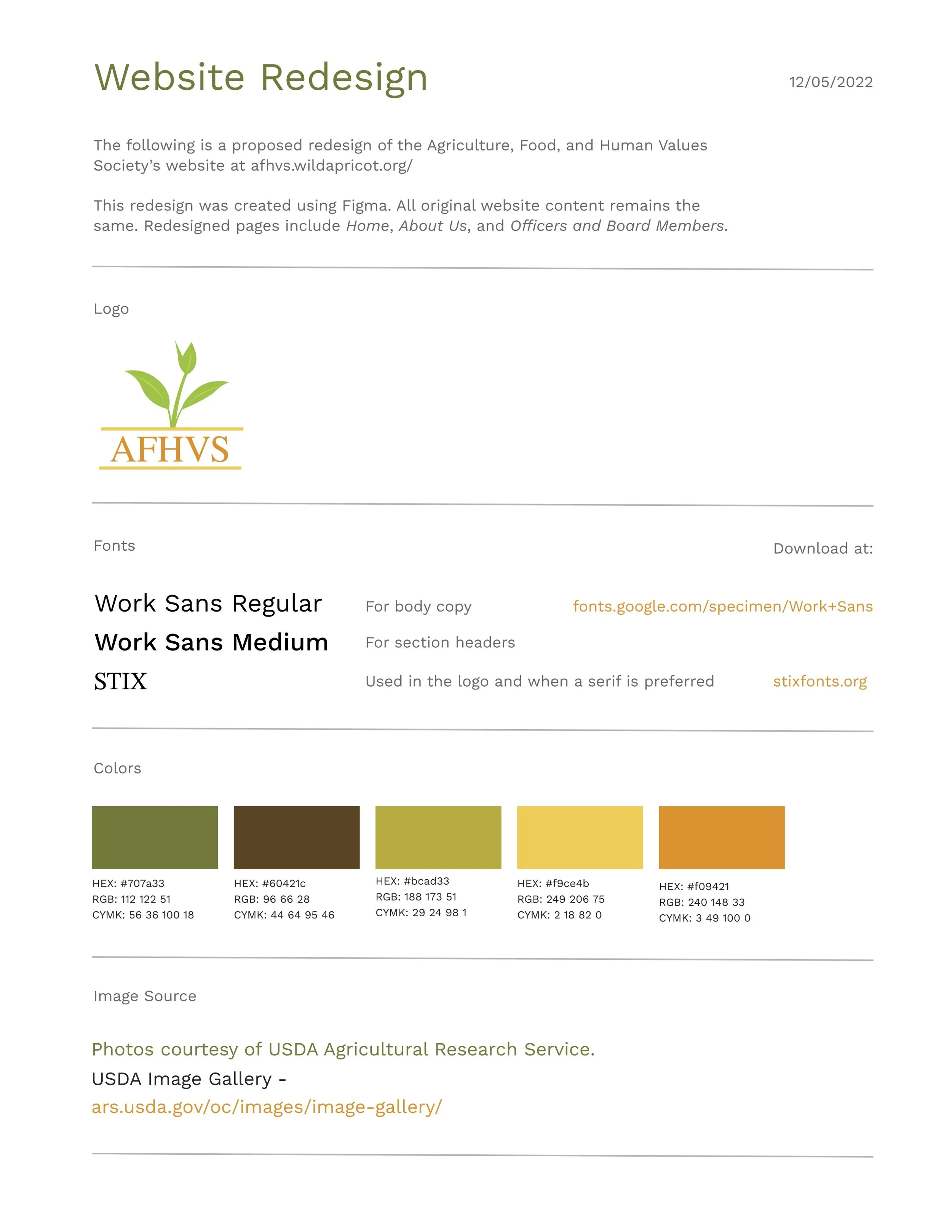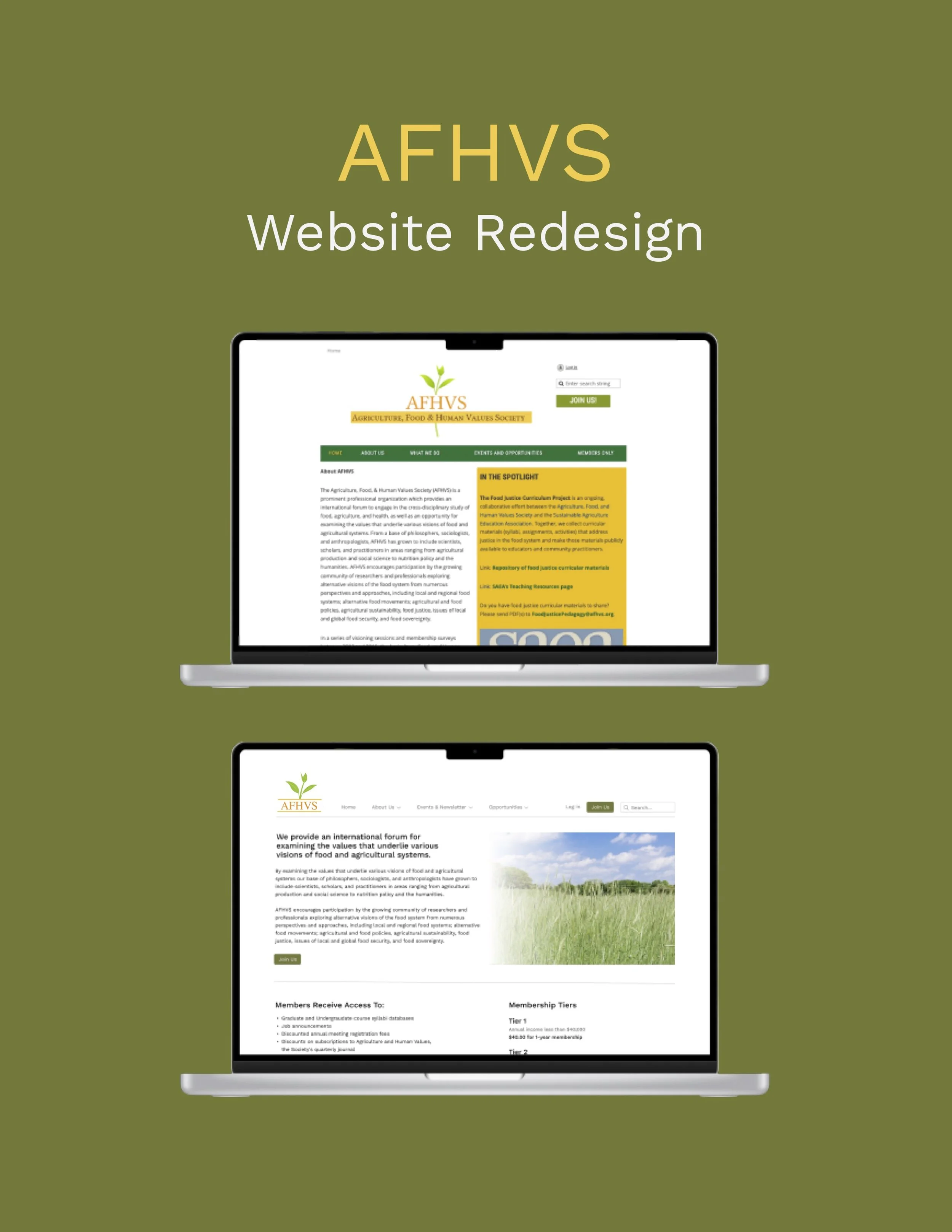 As part of a service-based learning class, I worked with a team of four other public communications students to provide the Agriculture, Food, & Human Values Society (AFHVS) with an updated digital identity and strategy. Deliverables included a mini brand identity kit, a logo redesign, recommendations for social media strategy and hiring practices, social media templates, letterhead templates, an email newsletter template, and a mockup of a website redesign for a future web designer.
