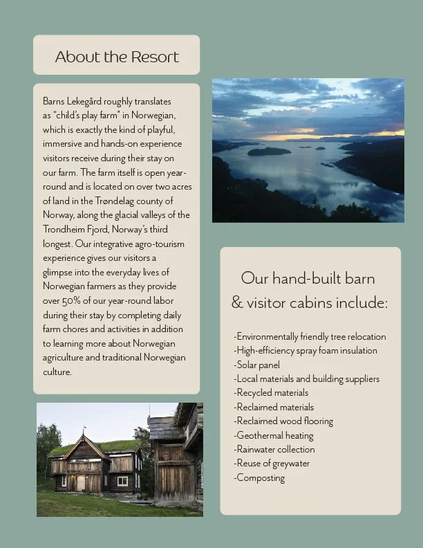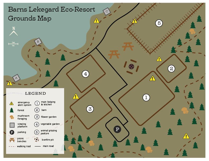 Inspired by a prompt to create a full brand identity for an eco-tourism resort, Barns Lekegård is a concept for a rural farm stay and eco-resort located in the Trøndelag region of Norway. The kit includes logo development, stationary and business cards, a creative ad campaign with three print advertisements, an illustrated poster, a t—shirt, and a branded resort map and guide.